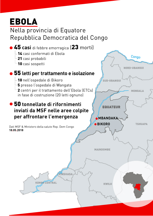 Le équipe di emergenza sono già sul posto e hanno organizzato una zona d’isolamento nell’ospedale principale di Mbandaka (5 posti letto) e una nell’ospedale di Bikoro (10 posti letto). Le équipe, inoltre, stanno installando due Centri per il Trattamento dell’Ebola (CTE) a Mbandaka e Bikoro, ognuno da 20 posti letto.
